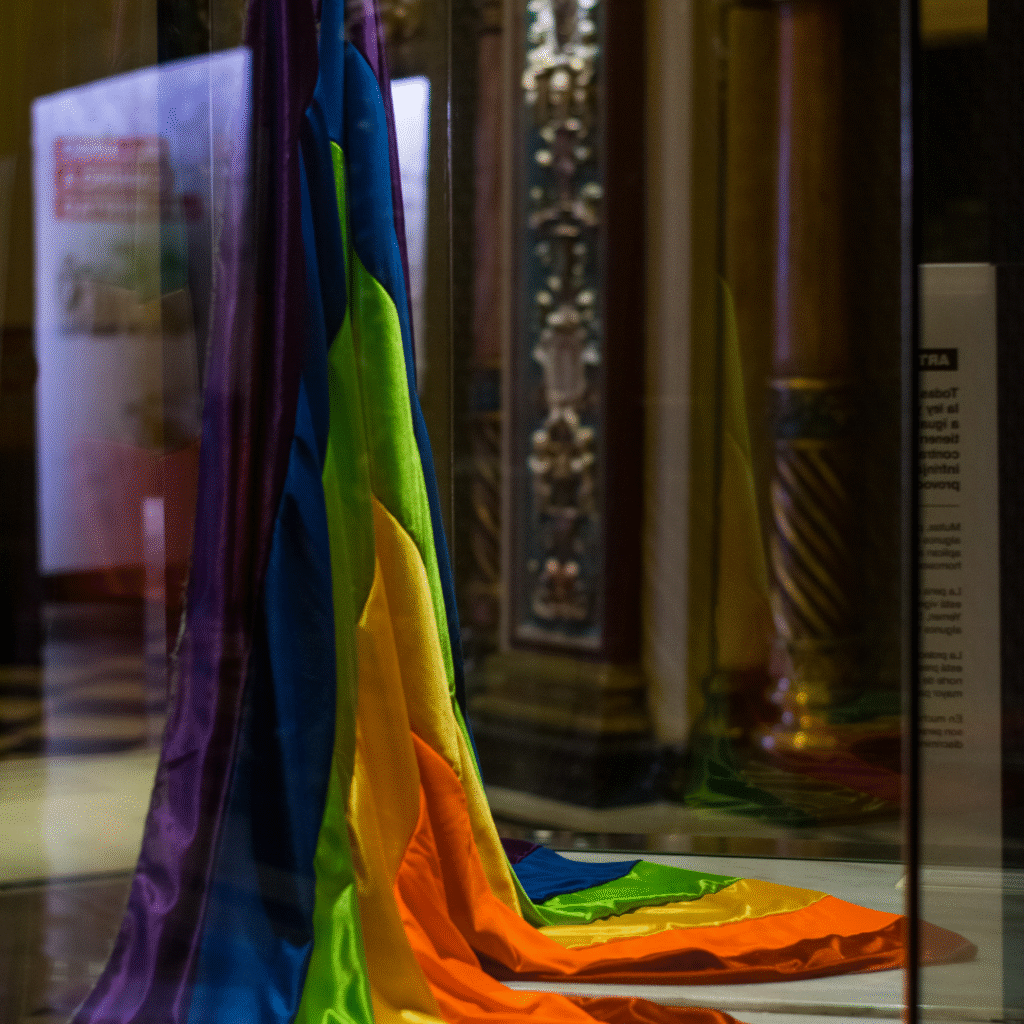 La bandera del orgullo junto al artículo 7 en aquella vitrina y la imagen de Canela Grandi buscan mostrar una democracia expansiva y plena cuando incluye, visibiliza y protege a todas las identidades.